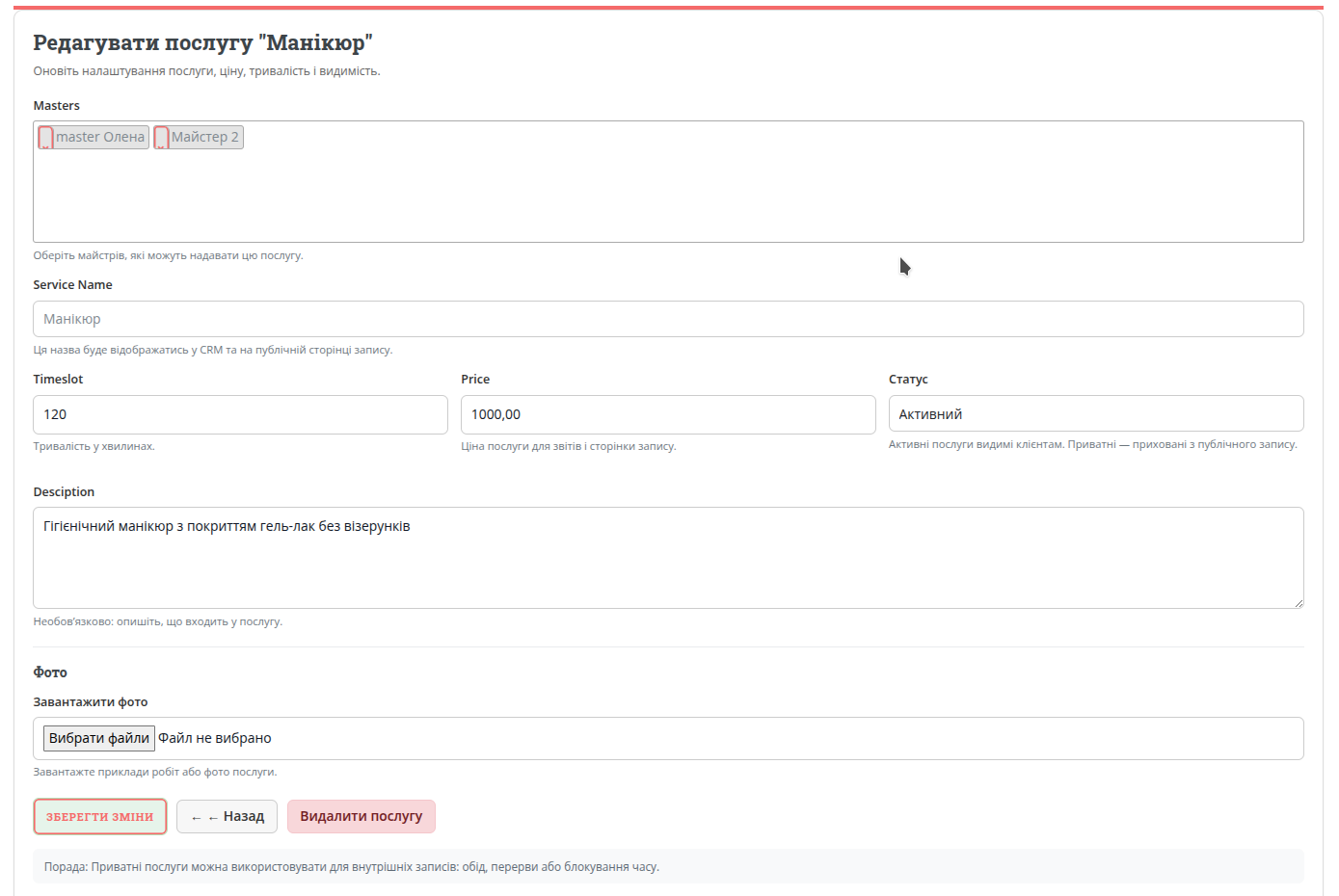 Pakalpojums ir konkrēts pieraksta veids, ko klients redz jūsu lapā.