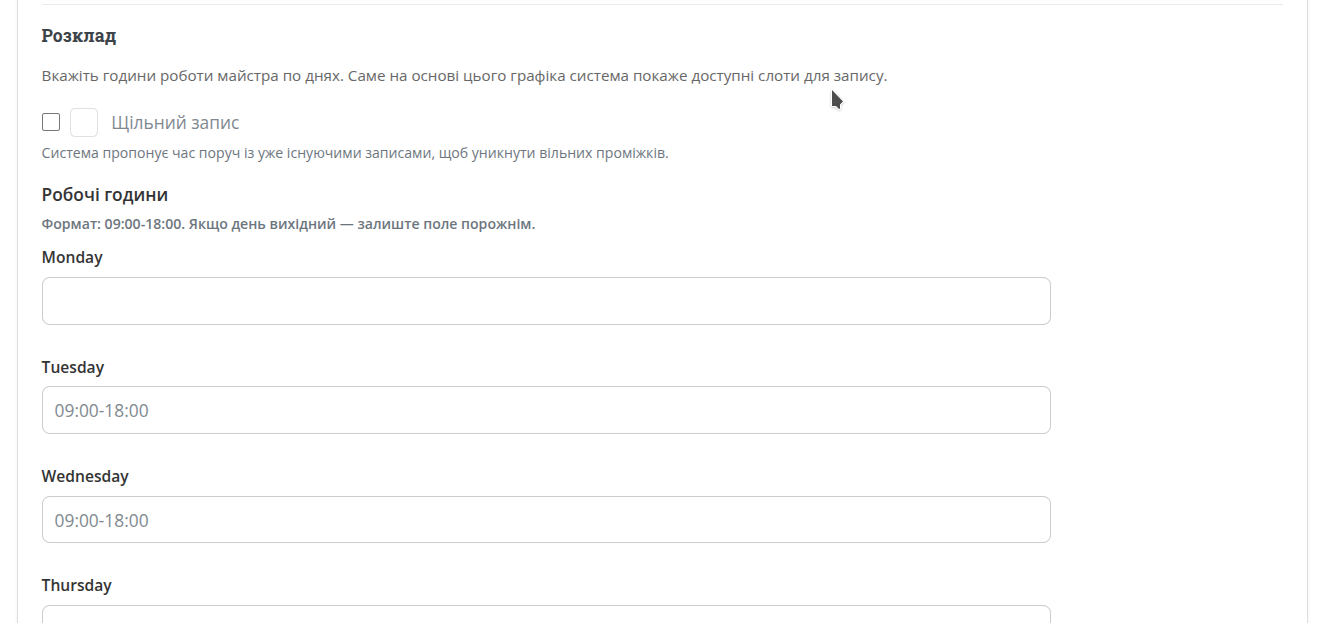 Для кожного дня введіть час у форматі 09:00-18:00.