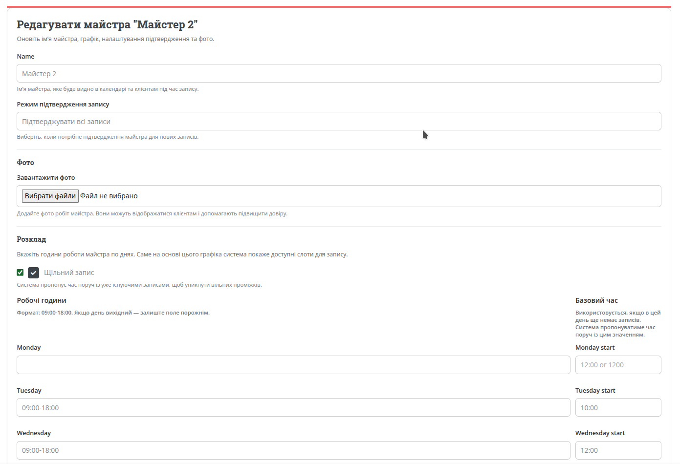 Кожен запис у системі прив’язується до конкретного майстра. Саме для нього формується календар, графік роботи і список доступних слотів. Майстрів може бути декілька, а може бут один